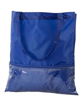 Sacosa de cumpărături din poliester cu mâner lung și buzunar transparent, cu fermoar pe partea din față.